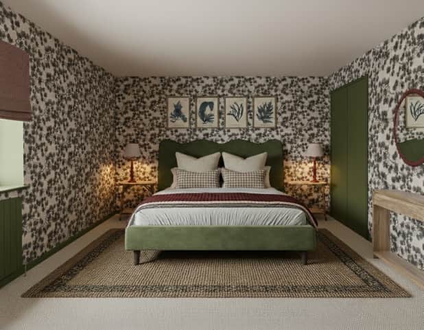 Head upstairs (the stairs are a little steep, so guests will need good mobility). At the front of the cottage is the master bedroom with a super king-size bed, high ceilings and calming botanical green tones that make it a lovely place to relax and recharge.